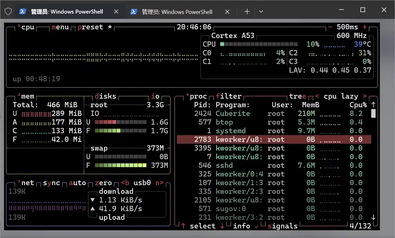 可以很明显地发现,这个服务端的地图生成、生物逻辑以及众多特性与原版存在些许差异(比如大白天出来和你贴贴的苦力怕酱)。但服务端的占用极低,在放了一堆生物和TNT乱炖的情况下,这颗骁龙410总占用率20%不到,频率长时间在600Mhz,连口气都不带喘。